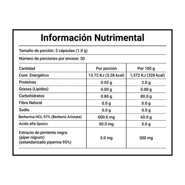 Una combinación de ingredientes clave en cápsulas de 500 mg. Este producto aporta berberina HCL y ácido alfa lipoico, en una fórmula reforzada con piperina proveniente de la pimienta negra.
