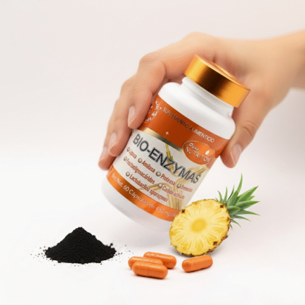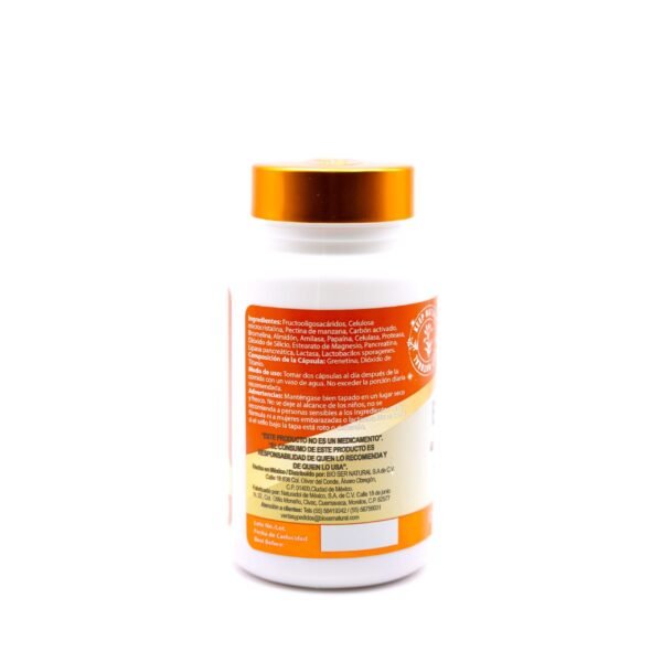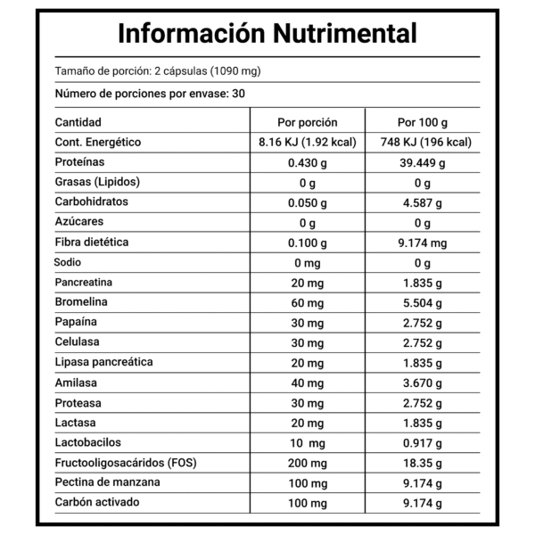 Fructooligosacáridos,pectina de manzana, carbón activado, bromelina, amilasa, papaína, celulasa, proteasa, dióxido de silicio, pancreatina, lipasa, lactasa, lactobacilos esporágenos.