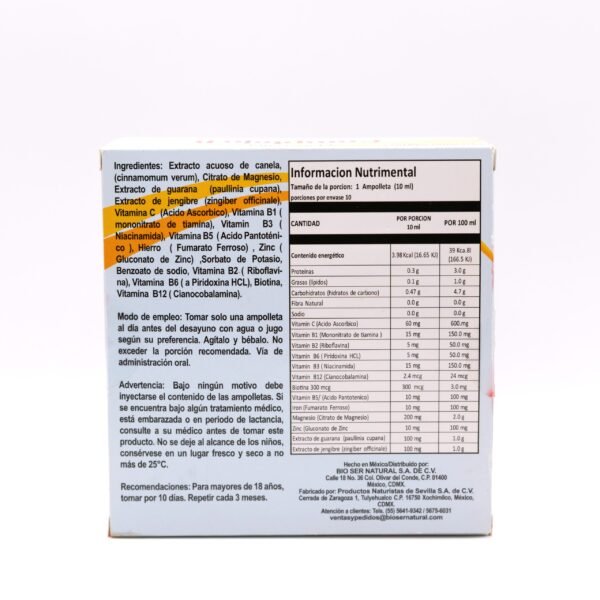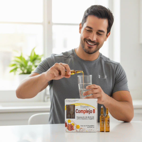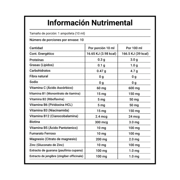 Diseñado como un apoyo para la vitalidad diaria, esta solución oral en ampolletas de 10 ml ofrece una combinación intensa de nutrientes. El núcleo de su fórmula es la concentración de vitaminas del Complejo B (B1, B2, B3, B5, B6, B12, y Biotina), complementadas con vitamina C. La mezcla se optimiza con hierro, magnesio y zinc, y se distingue por la inclusión de cafeína, ginseng y extracto de canela.