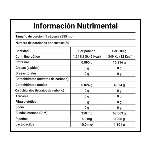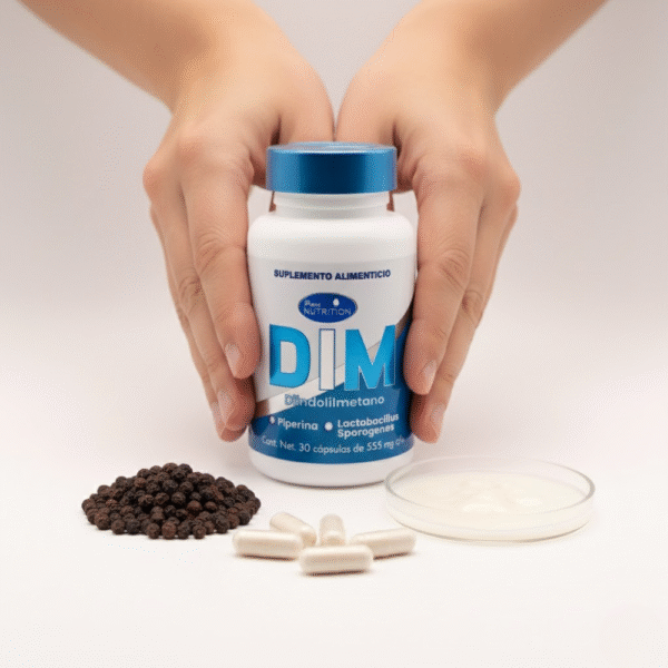 Cápsulas que combinan Diindolilmetano (DIM), probióticos y piperina, diseñadas para integrarse fácilmente a tu rutina diaria. Presentación práctica y de fácil consumo.