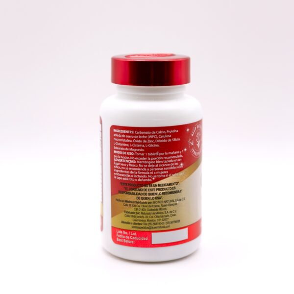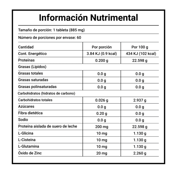 Tabletas de 885 mg que combina aminoácidos como glicina, L-cistina y L-glutamina, junto con proteína de suero y óxido de zinc. Formulado para integrarse fácilmente a tu rutina diaria, ofreciendo una forma práctica de consumir sus ingredientes.