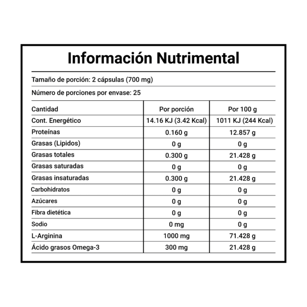 L-Arginina + Omega 3 combina aminoácidos y ácidos grasos esenciales en cápsulas prácticas de 700 mg. Su fórmula está diseñada para aportar un equilibrio natural que acompaña la energía y vitalidad del día a día. Una manera sencilla y moderna de complementar tu bienestar desde adentro.