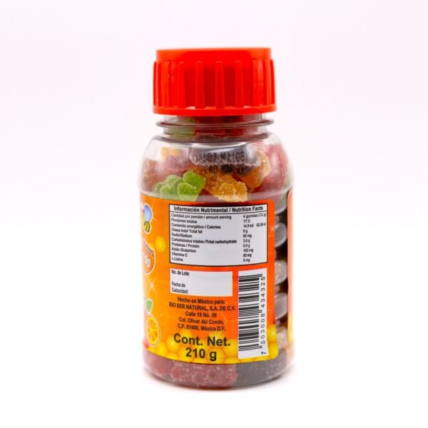 Azúcar, grenetina, glucosa, miel de abeja, miel de maíz, ácido ascórbico, ácido cítrico, L-lisina, glutámico, colores y sabores de origen natural.