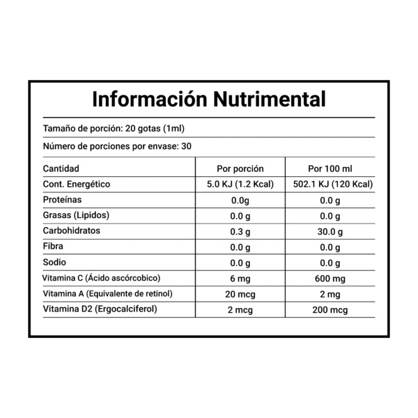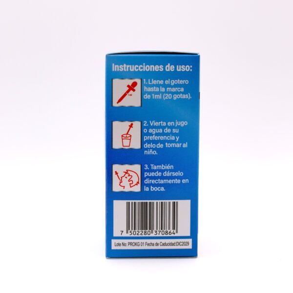Se sugiere llenar el gotero hasta la marca de 1 ml. (20 gotas) viértalo en un jugo o agua de su preferencia y delo de tomar al niño. También puede dárselo directamente en la boca, recomendado para niños de 2 a 12 años. Se recomienda ingerir 1 porción por día.